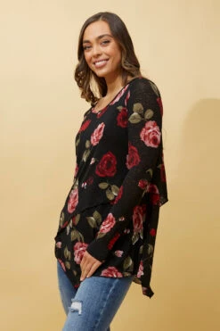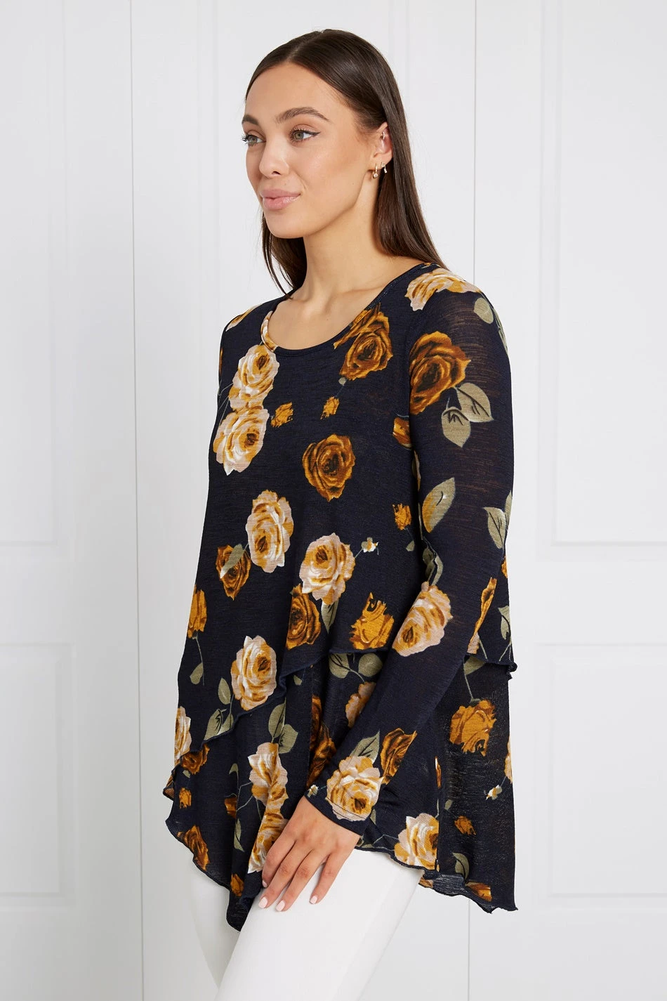 Fun and sweet, our Bobby double layered top with a sunshine floral print and asymmetrical hem is a must-have this season! Easy to pair with everyday jeans and sneakers, this top is perfect for your next shopping day out!