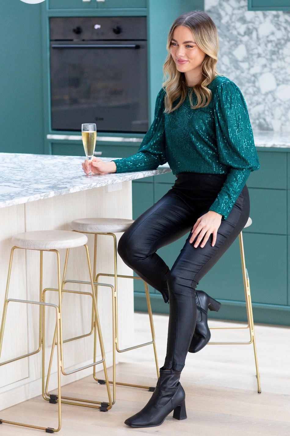 Take over your next occasion with this glamorous Declan Sequin Top! Featuring long juliet sleeves with wide buttoned cuffs, this evening top can be paired with your favourite fitted pants or skirt to complete that fab party look! The perfect glam top for winter!