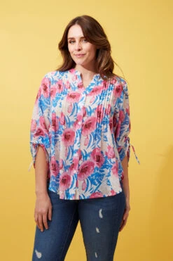 This floral pleated blouse will keep you looking fresh & stylish all season long with its soft semi sheer fabric and button up front that can be worn open or closed. Match this lovely top over a denim or 3/4 capris and a summer hat.