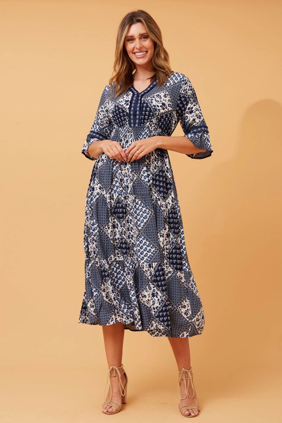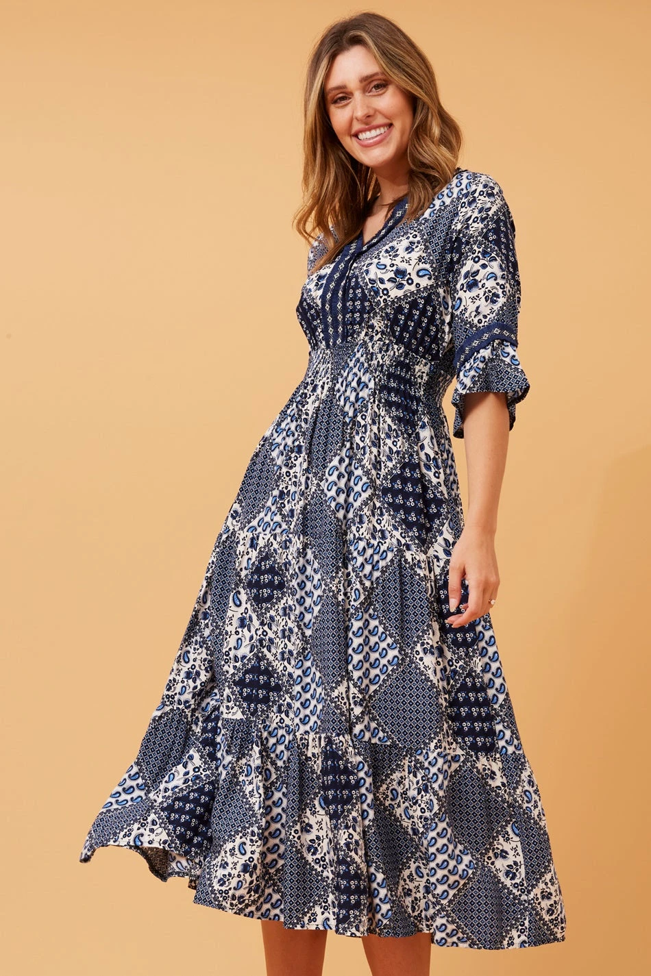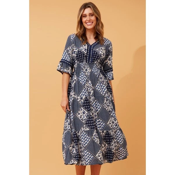 Embrace the artistry of thre Gilma Patchwork Print Midi dress and step into the day with confidence, knowing you’re adorned in a dress that effortlessly balances trend setting style with classic comfort.