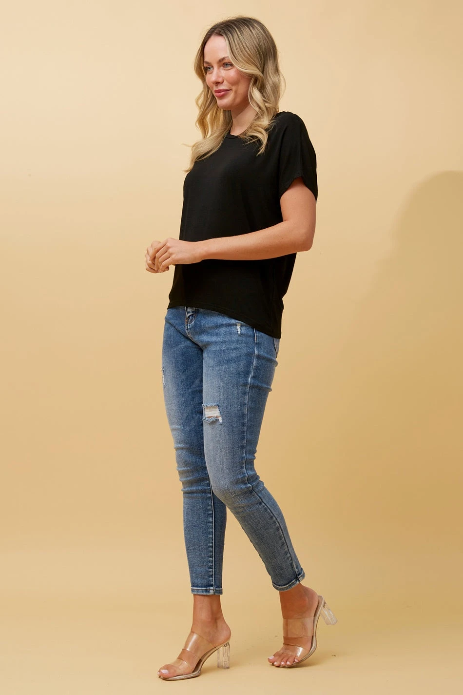 Not so basic basics! Keep cool and comfortable this season in our solid Jillie tshirt. Style with jeans, shorts or skirts for a relaxed and effortless look!
