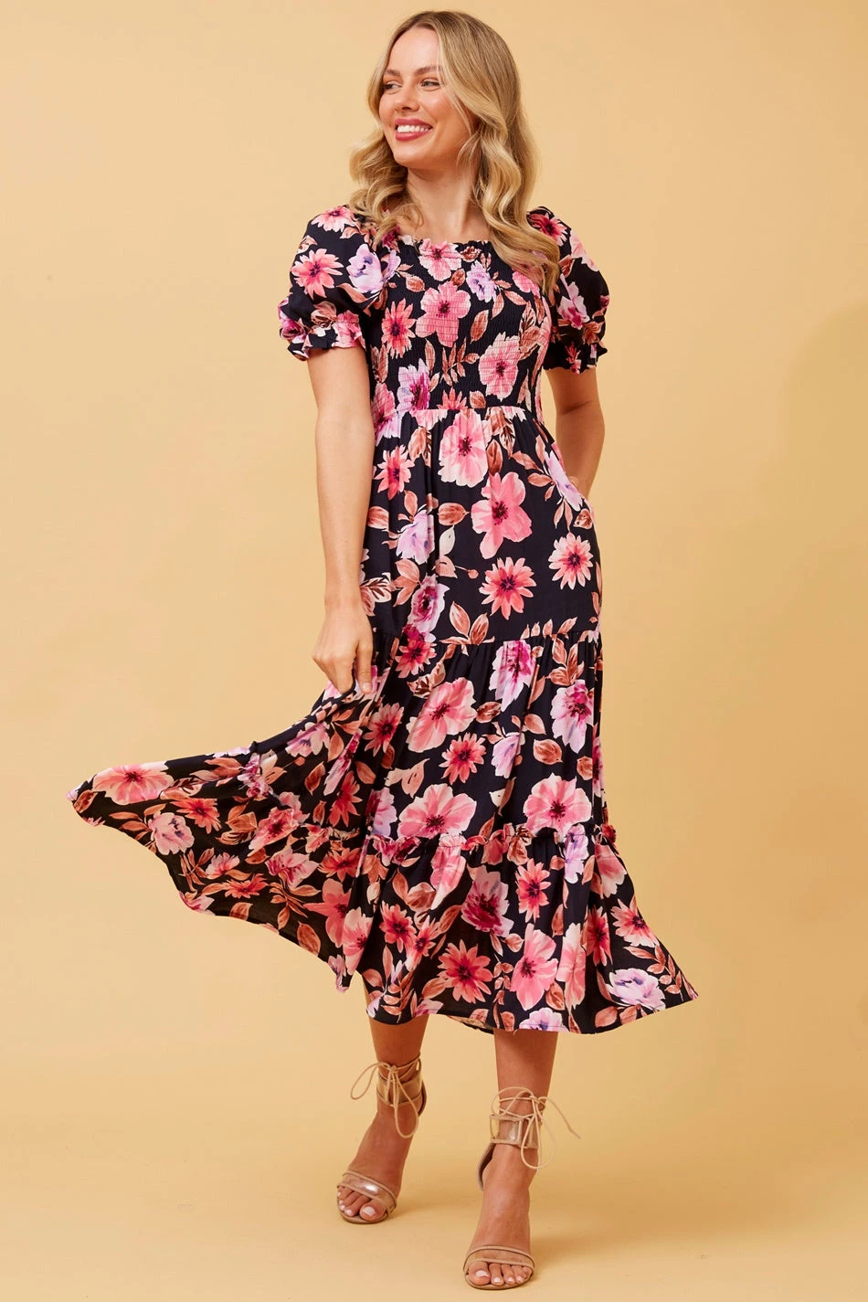 In floral print, this shirred dress will work for any occasion in your schedule. Dress this piece up with high-block heels or replace them with white sneakers for a casual alternative.