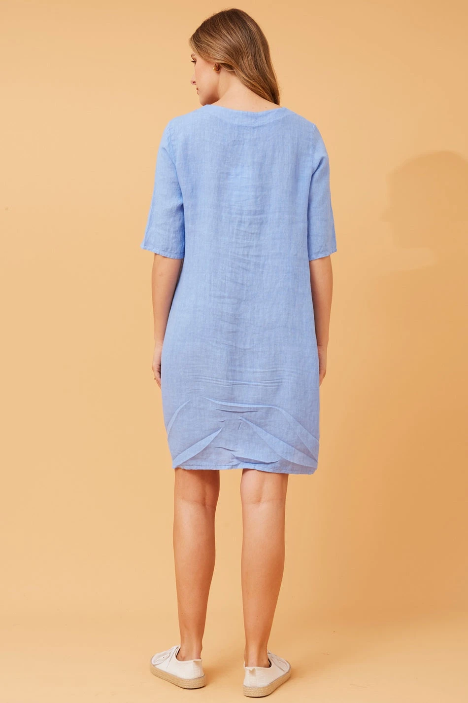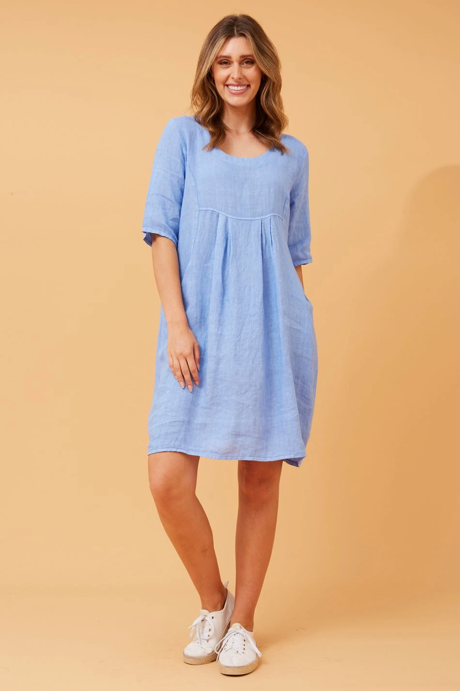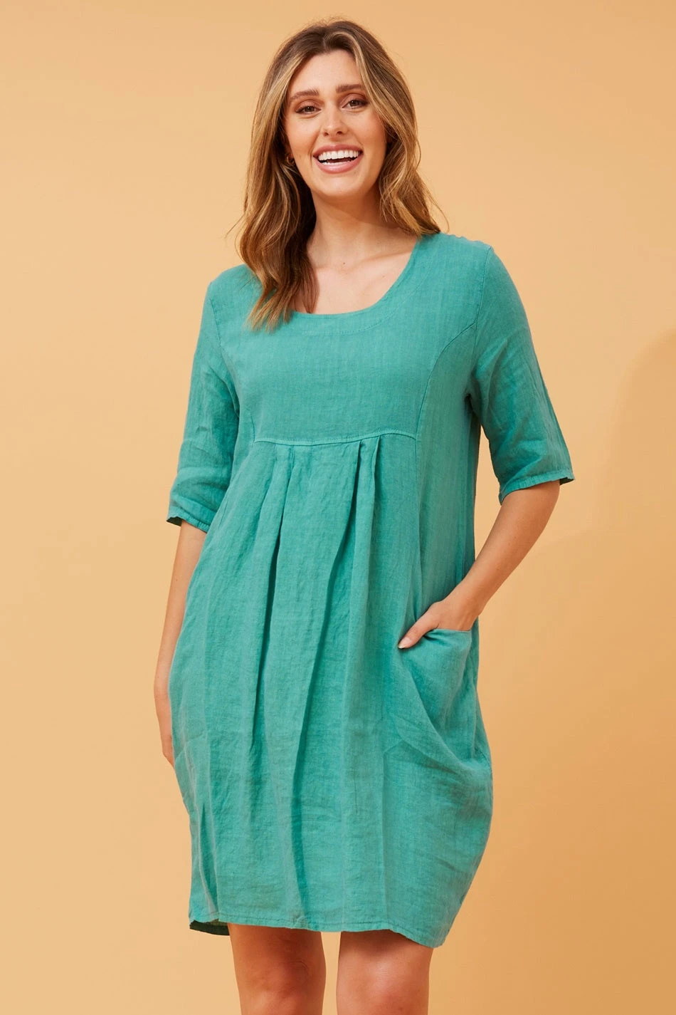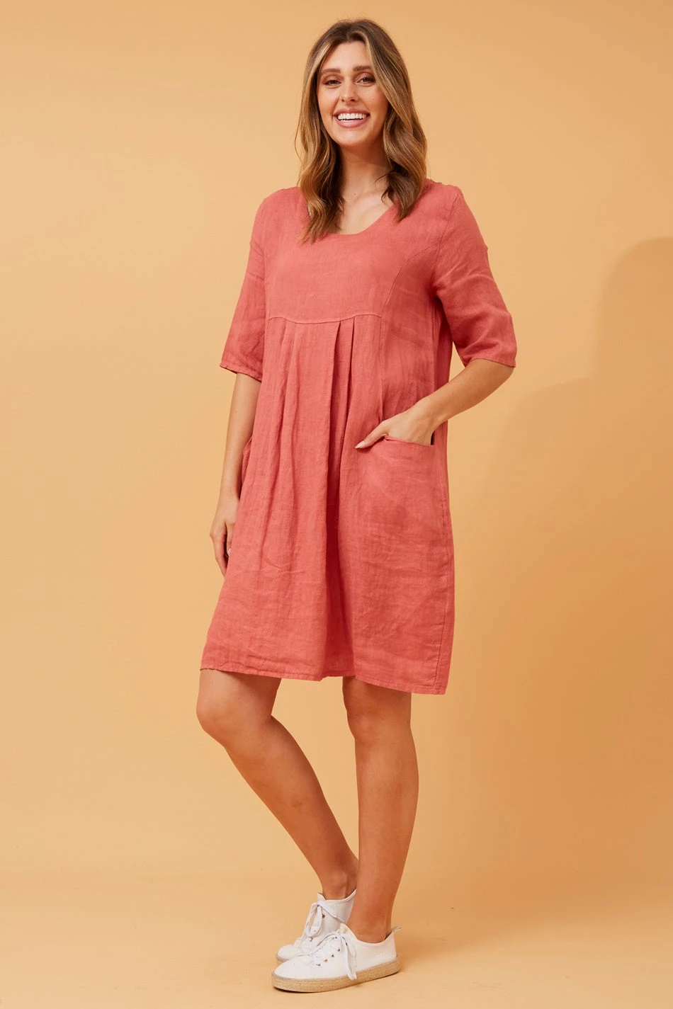 The 3/4 sleeves offer a stylish and versatile look, making it suitable for various settings. Additionally, the dress is thoughtfully designed with two side pockets, adding a practical and casual element to the ensemble.Â