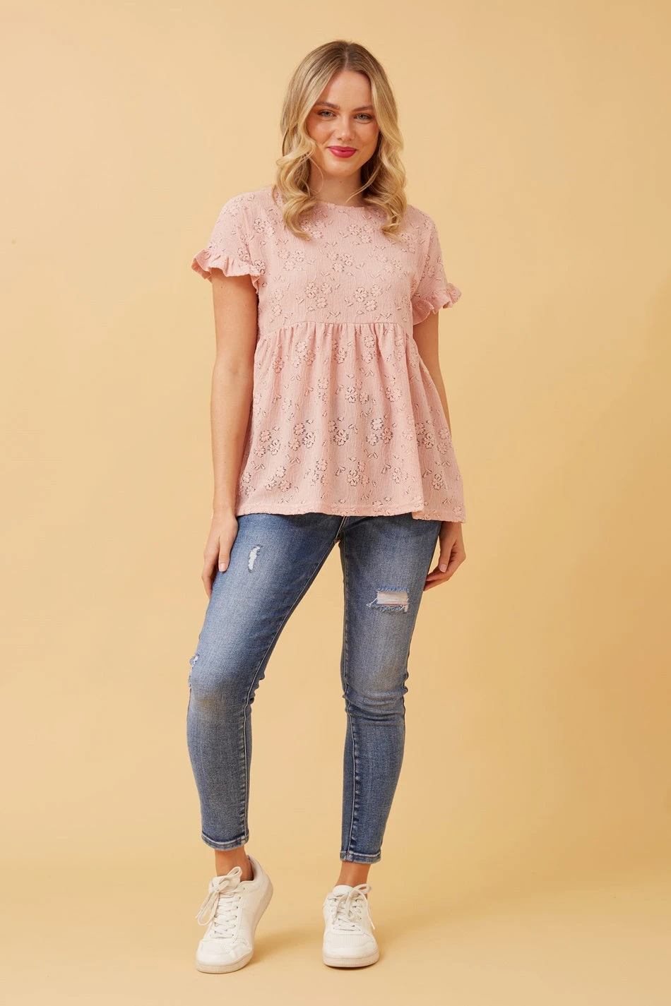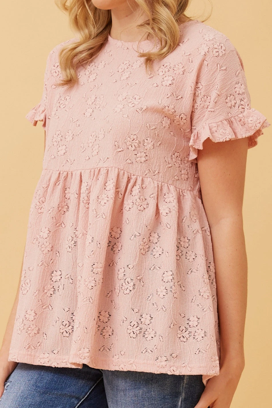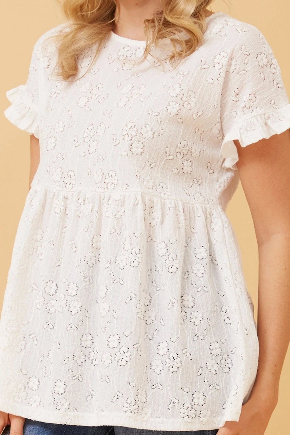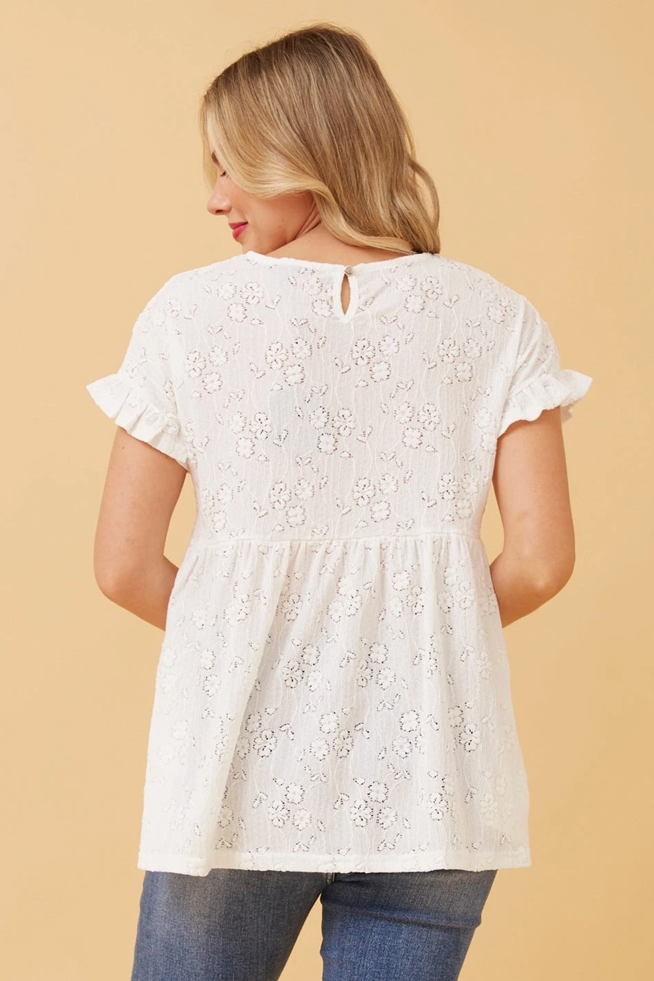 Pretty as can be with fluttery sleeves this romantic babydoll top will quickly become a warm-weather favorite. The smocked bodice boasts a flattering cut, accented by lace embroidered florals. Take on every outing with confidence!
