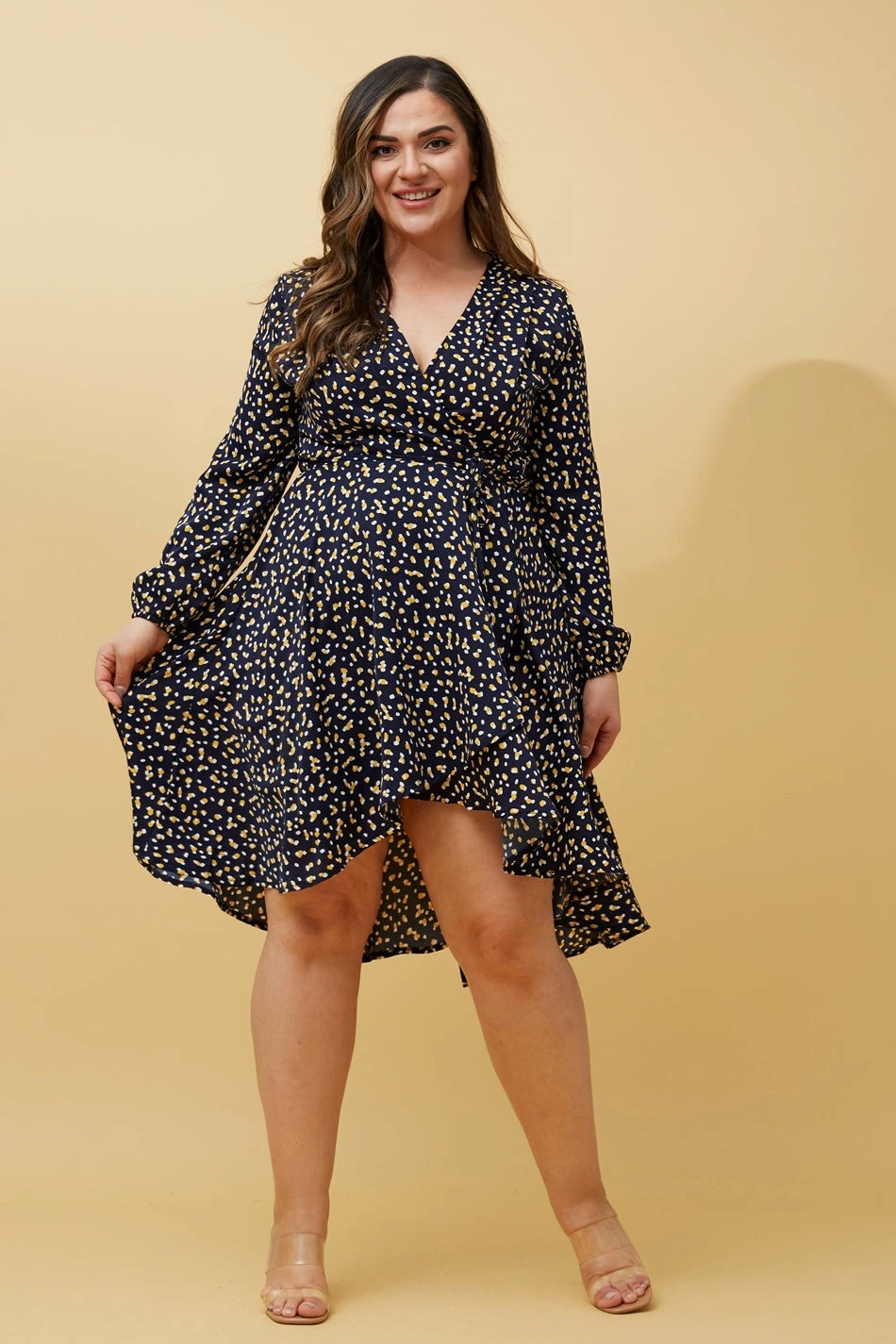 Add this gorgeous wrap dress to your wardrobe. Fabricated from a lightweight fabric with a delicate print. Designed with a wrapped feature and secured through a self side tie fastening and ease this beautifully draped front dress. Team perfectly with strappy heels or ankle boots.