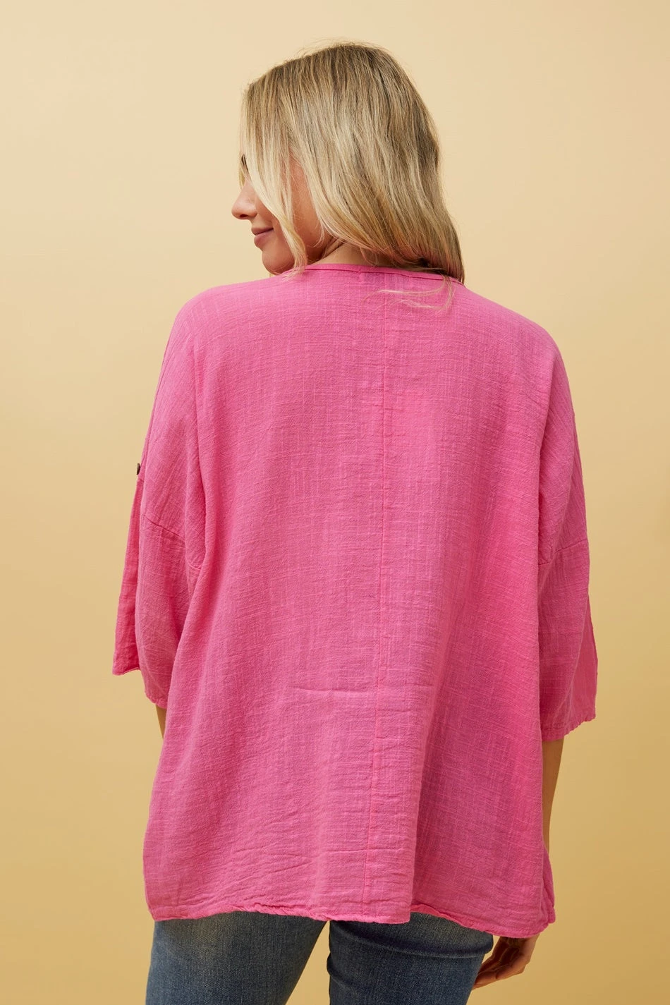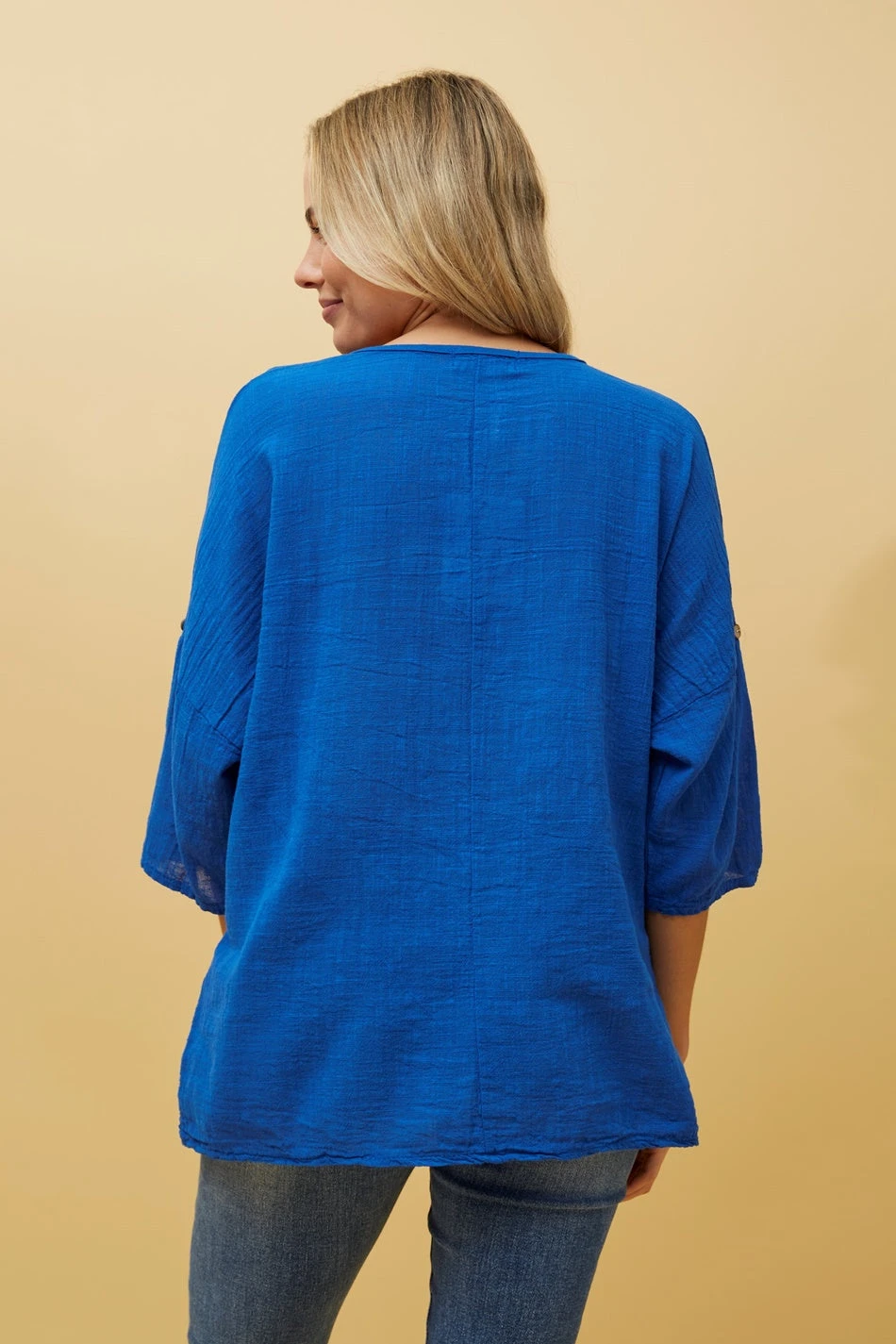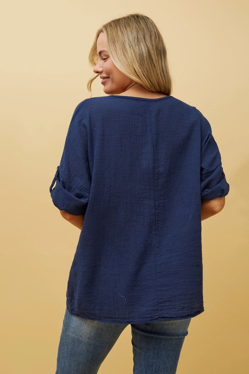 Stay comfortable and stylish this season in our Zonya sequin star patch top. Easy to style with any pants for a cool and casual look!